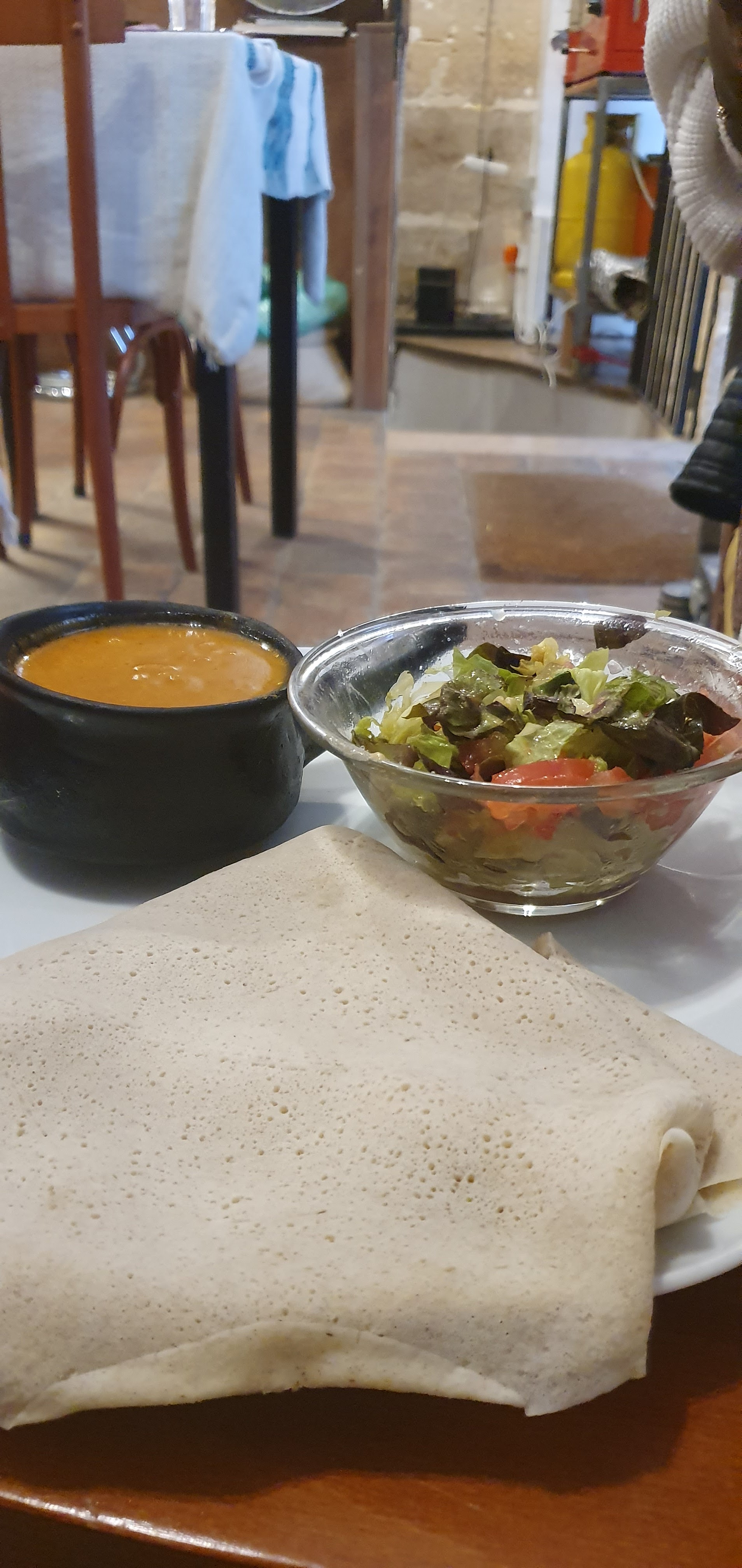Alors ce petit resto éthiopien est une grande découverte ! Le serveur t'accueille avec un grand sourire, t'explique et t'aide à choisir ton plat. Les plats sont clairement faits maison. Les goûts sont prononcés. Les épices sont bien présentent. La crêpe est tendre et bonne. Bref, je recommande !